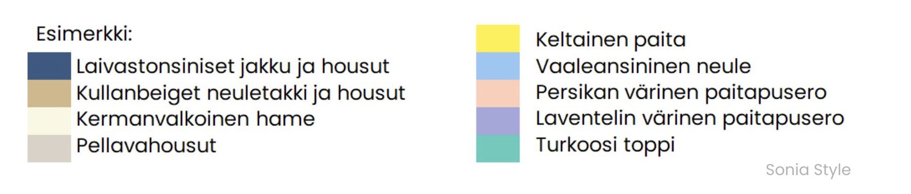 Vältettävät sävyt: Musta, puhtaan valkoinen ja sinipohjaiset, kylmät sävyt.