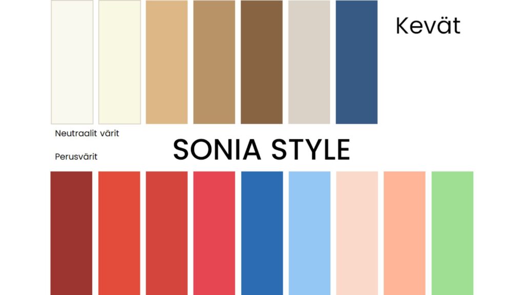 Sävyjen muistisäännöt: Kevään sävyt ovat kirkkaita, lämpimiä ja heleitä. Kirkkaat värit ovat raikkaita ja aurinkoisia, vaaleat värit heleän pastellisia.