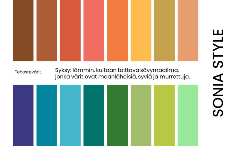 Sävyjen muistisäännöt: Kevään sävyt ovat pehmeitä, lämpimiä ja maanläheisiä. Tummat värit ovat syvän kylläisiä ja murrettuja, vaaleat värit murrettuja tai kirkkaita, täyteläisiä sävyjä.