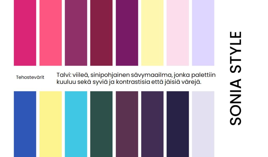 Sävyjen muistisäännöt: Talven sävyt ovat kirkkaita, kylmiä ja voimakkaita. Tummat värit ovat hieman mustalla taitettuja, ja vaaleat värit melkein valkoisia.